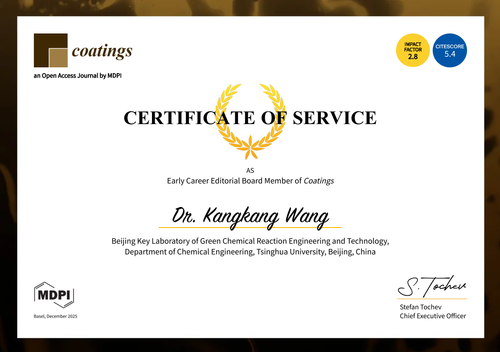 近日,本课题组博士后王康康、冯李楠、苏未寅、陶爽成功入选国际学术期刊《Coatings》的首届青年编委会。此次全球范围内遴选100位青年学者,课题组四位成员凭借在光热调控材料等研究领域的突出成果入选。